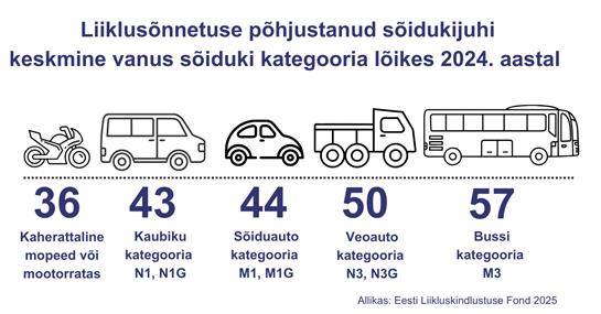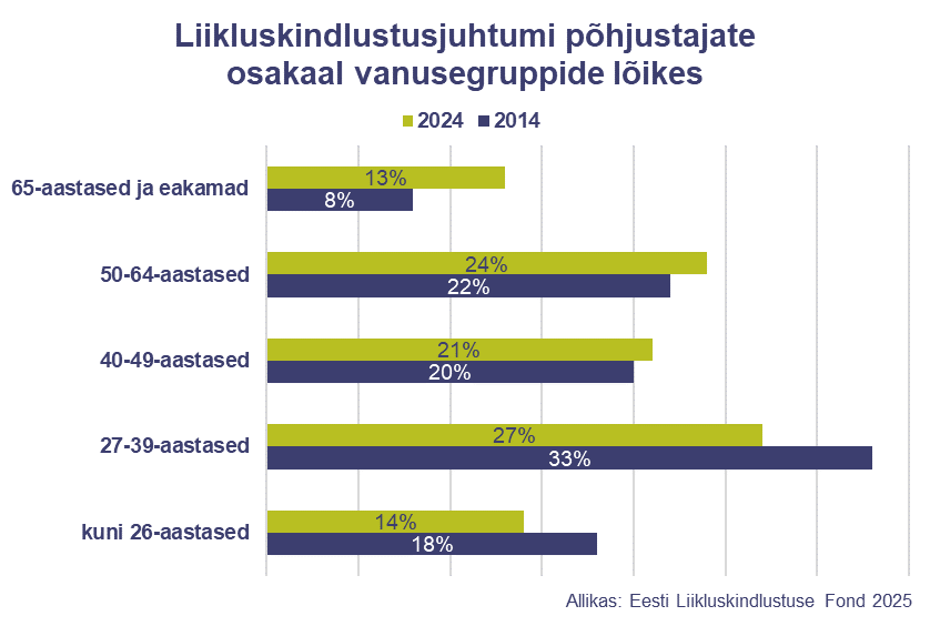 Eesti Liikluskindlustuse Fondi (LKF) andmetel on liikluskindlustusjuhtumite põhjustajate keskmine vanus kasvanud viie aasta võrra igal kümnendil. Kui 2000. aastate alguses olid õnnetuste põhjustajad valdavalt 30ndates eluaastates juhid, siis 2012. aastal oli keskmine vanus juba 40 ning alates 2022. aastast 45 eluaastat. Keskmise vanuse kasv on seotud Eesti elanikkonna vananemisega. Kõige kiiremini suureneb 65+ vanuserühma osakaal liikluses, kes mullu põhjustasid juba 13% liikluskindlustusjuhtumitest.